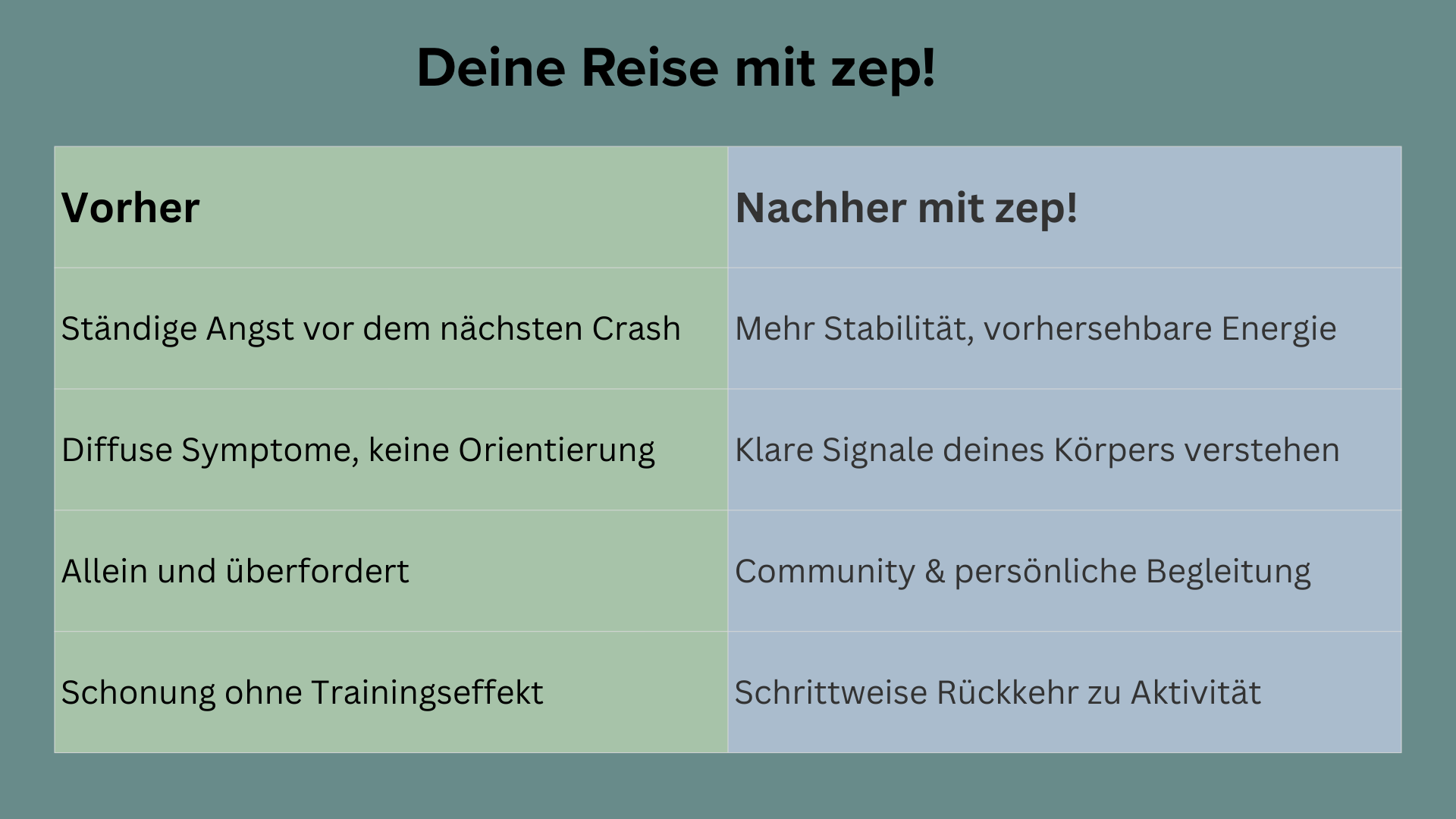 Neurozentriertes Training für Long COVID, ME/CFS und Post-Vakzin-Syndrom – Schritt für Schritt - oder wie wir sagen "Zep by Zep" -raus aus Fatigue, Crashs & Chaos. Zep! ist kein Mindset-Programm – wir arbeiten mit neurophysiologischen Tests und Test–Retest, um Regulation praktisch überprüfbar zu machen. Dein Weg beginnt mit einem Gespräch: